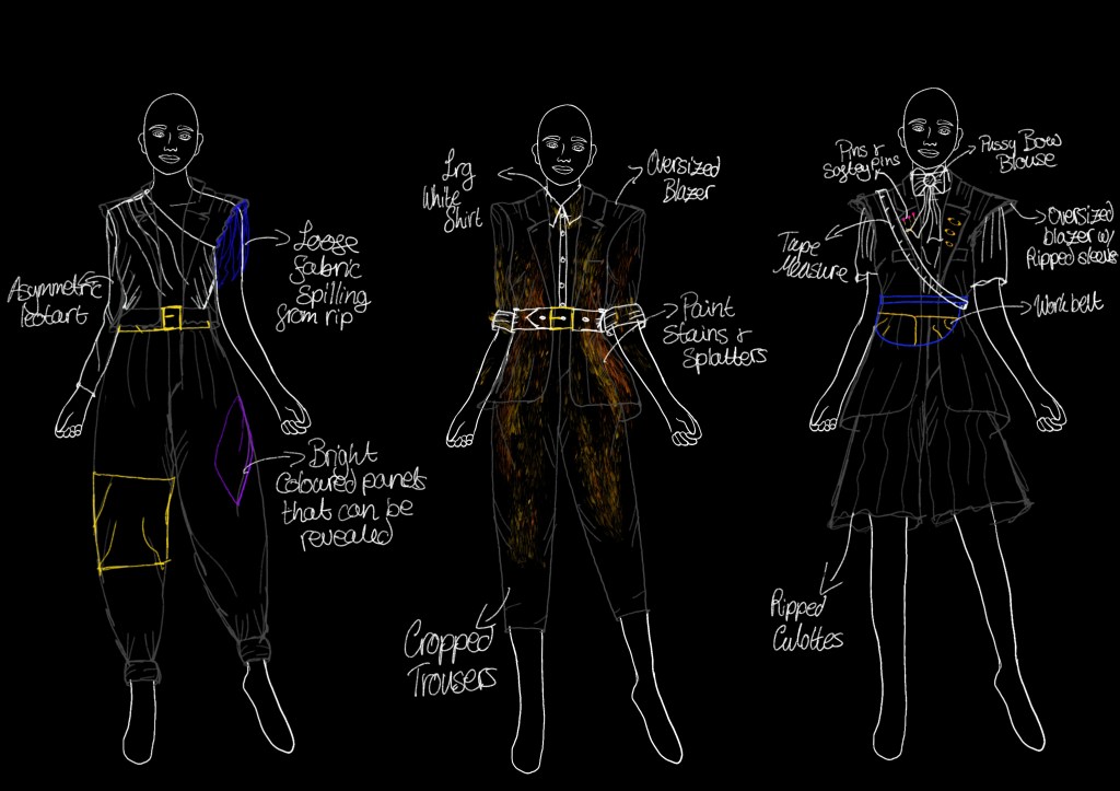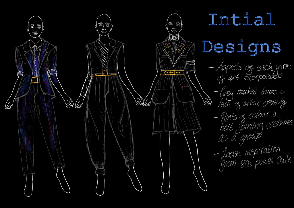 I wanted each character to be distinct to the artistic field so the artist covered in paint the dancer with headphones and the designer with tape measures and safety pins attached to her jacket. This very detail orientated form of designing is something new that I haven’t really explored before so I found this a really new and exciting project. I discussed my ideas throughly with my group and found that they were very open to let me make final decisions and allowed me to take charge which was different to the previous group who had a much more input into what they wanted to be costumed in. Therefore I had to adapt to the different group styles. From this I learnt how important it is to allow your group to get their ideas across fully and be able to show them visually what your ideas are and how to combine the two together.